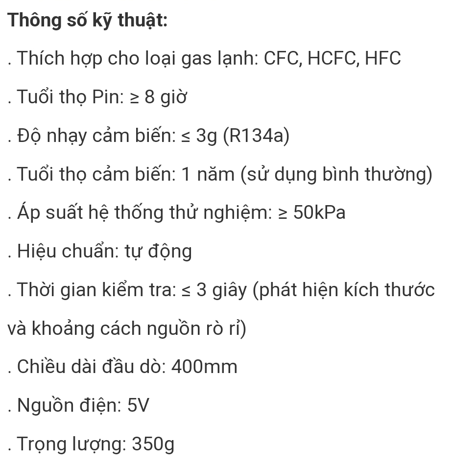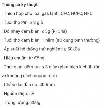 - Thiết bị kiểm tra rò rỉ ga lạnh VLD-2 dò tìm và phát hiện các mùi gas lạnh như sau:
